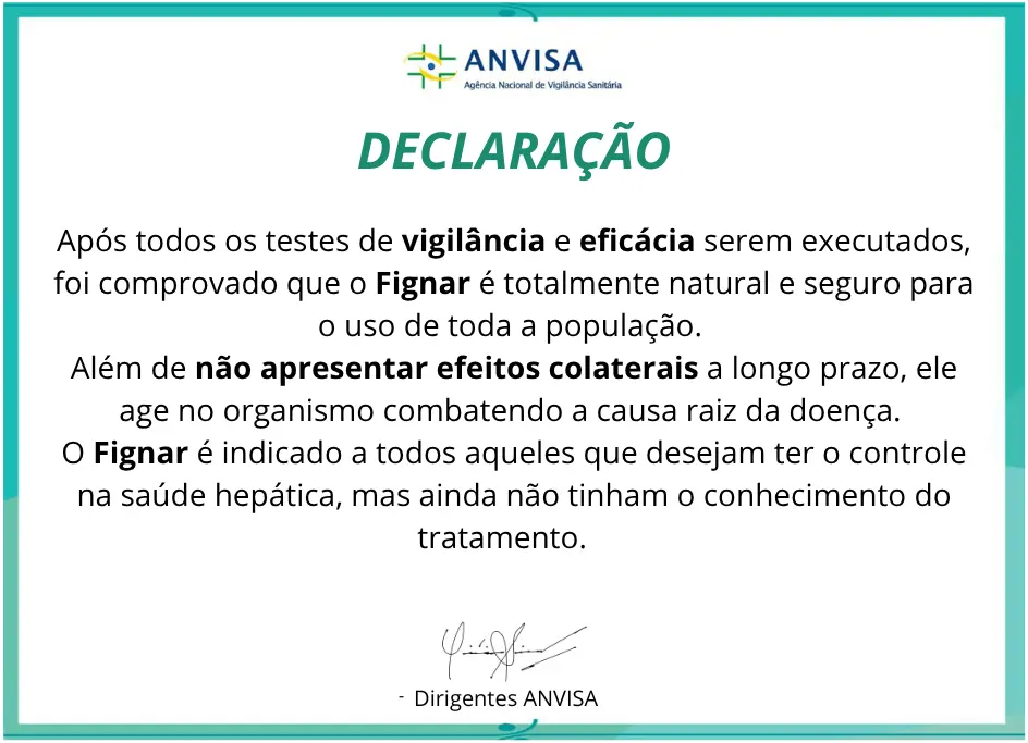 Sim! Fignar é oficialmente aprovado pela ANVISA sob o registro 25351.691202/2021-31, após rigorosos testes de eficácia e segurança que comprovaram sua ação hepatoprotetora e regenerativa.